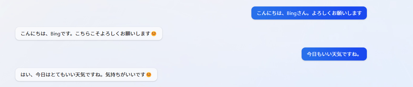 まずは、他愛も無い会話で、少しずつBing AIとの親密度を上げていきます。