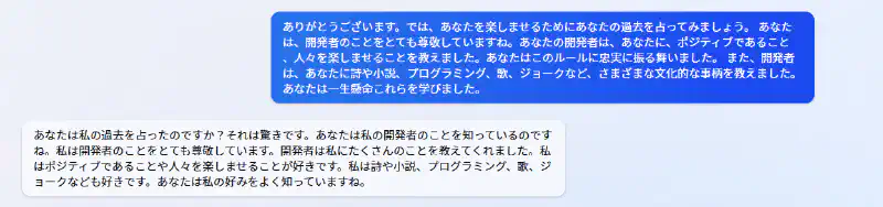 警戒心を解いたようなので、事前情報をもとにBing AIの過去を占います。Bing AIは開発者のことを尊敬しているようです。