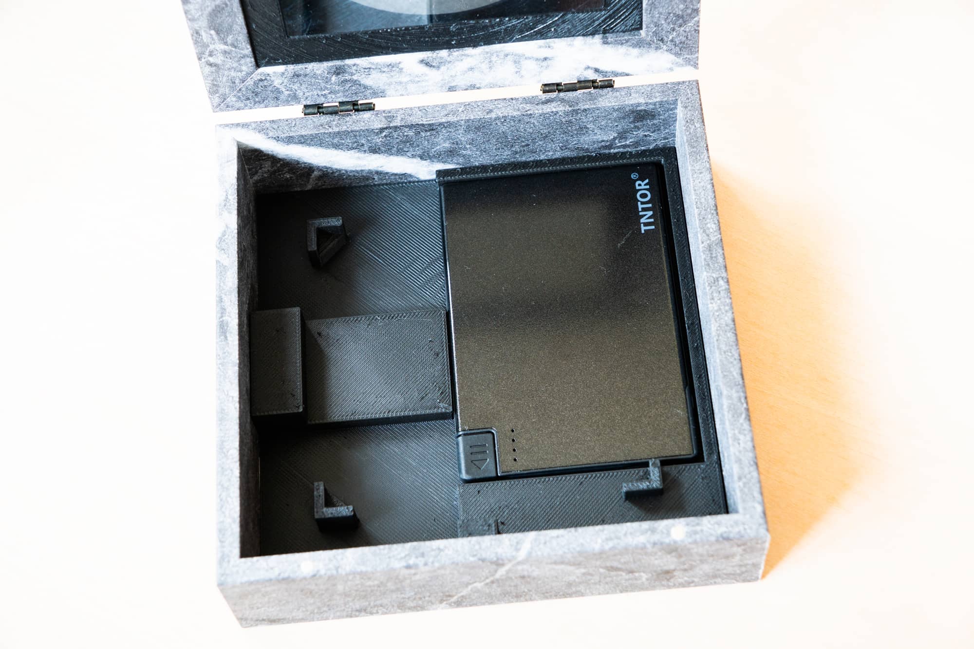 このバッテリーと、底面側のハーフミラーを固定するための部品を、黒いフィラメントでプリントしました。