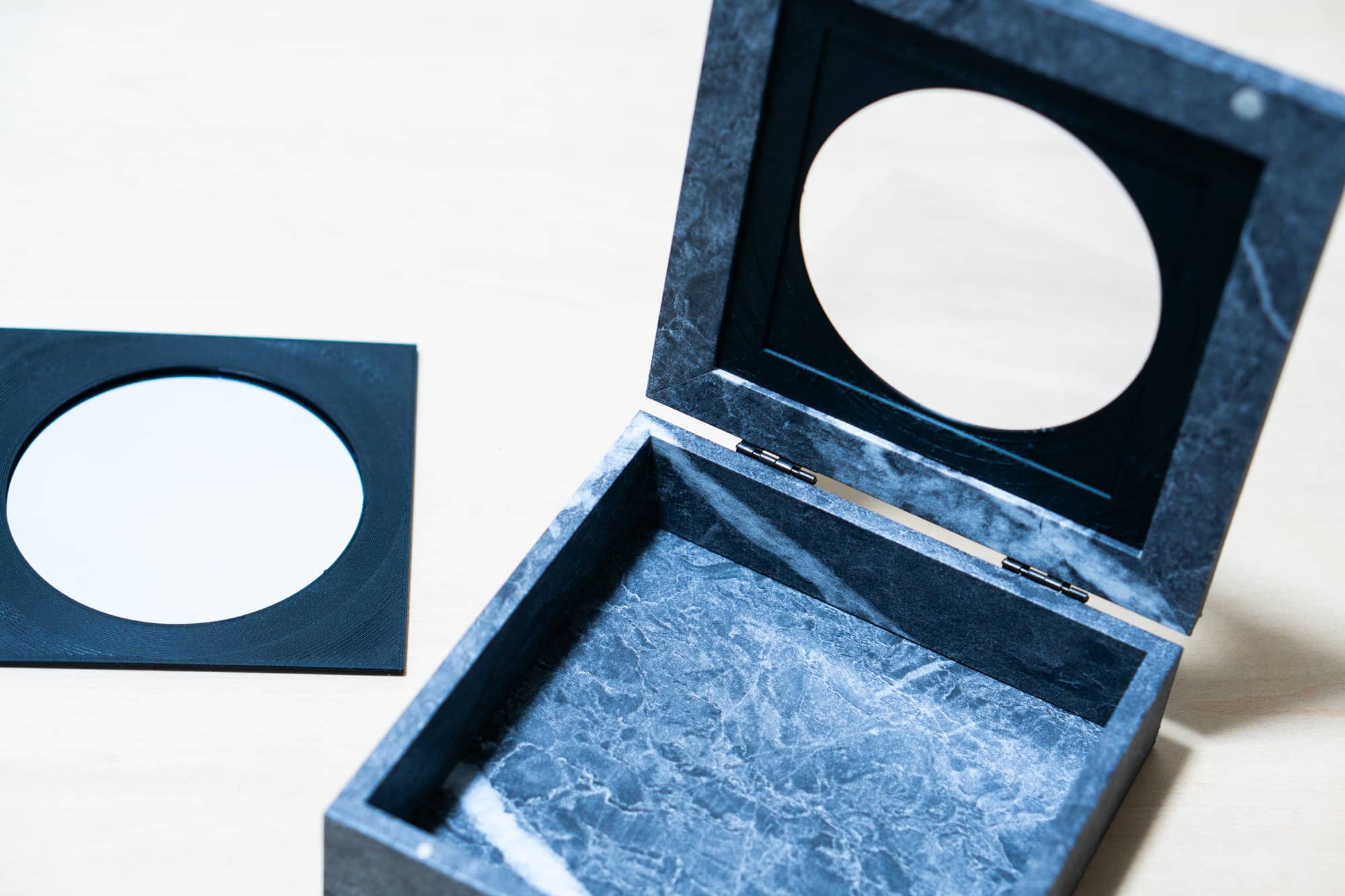 まず、箱のフタの内側に、ハーフミラーを貼り付けます。円形に切り抜いたように見せるため、視野を制限する枠を3Dプリンターで作成し、下から被せました。