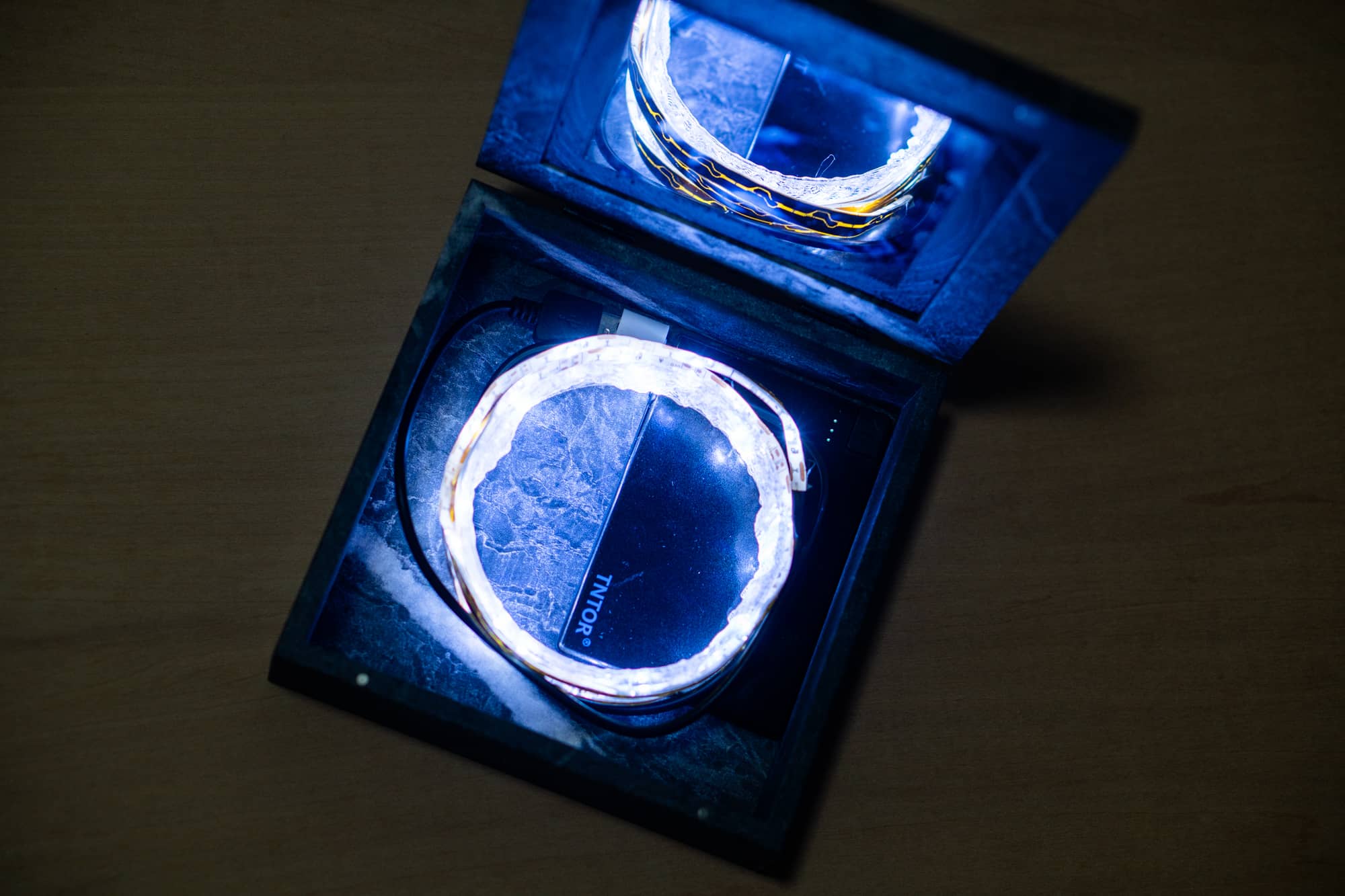 ダイソーのテープライトは5V/415mAなので、一般的なモバイルバッテリーで駆動できます。しかし、水晶の洞窟を設置すると箱の内部スペースはかなり限られます。